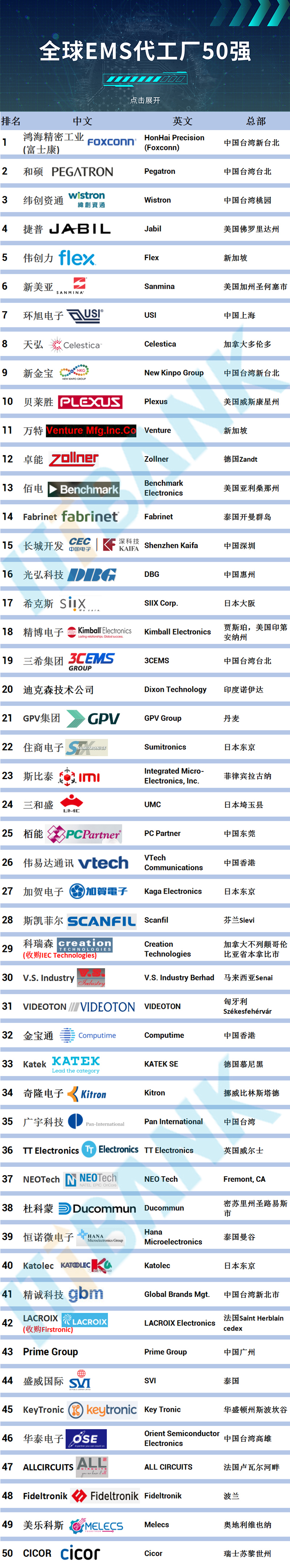 近期,ittbank發(fā)布了最新的全球EMS代工領(lǐng)域50強企業(yè)排行榜。這份報告不僅反映了當(dāng)前全球EMS行業(yè)的競爭格局,還為行業(yè)內(nèi)外人士提供了寶貴的數(shù)據(jù)參考與趨勢洞察。